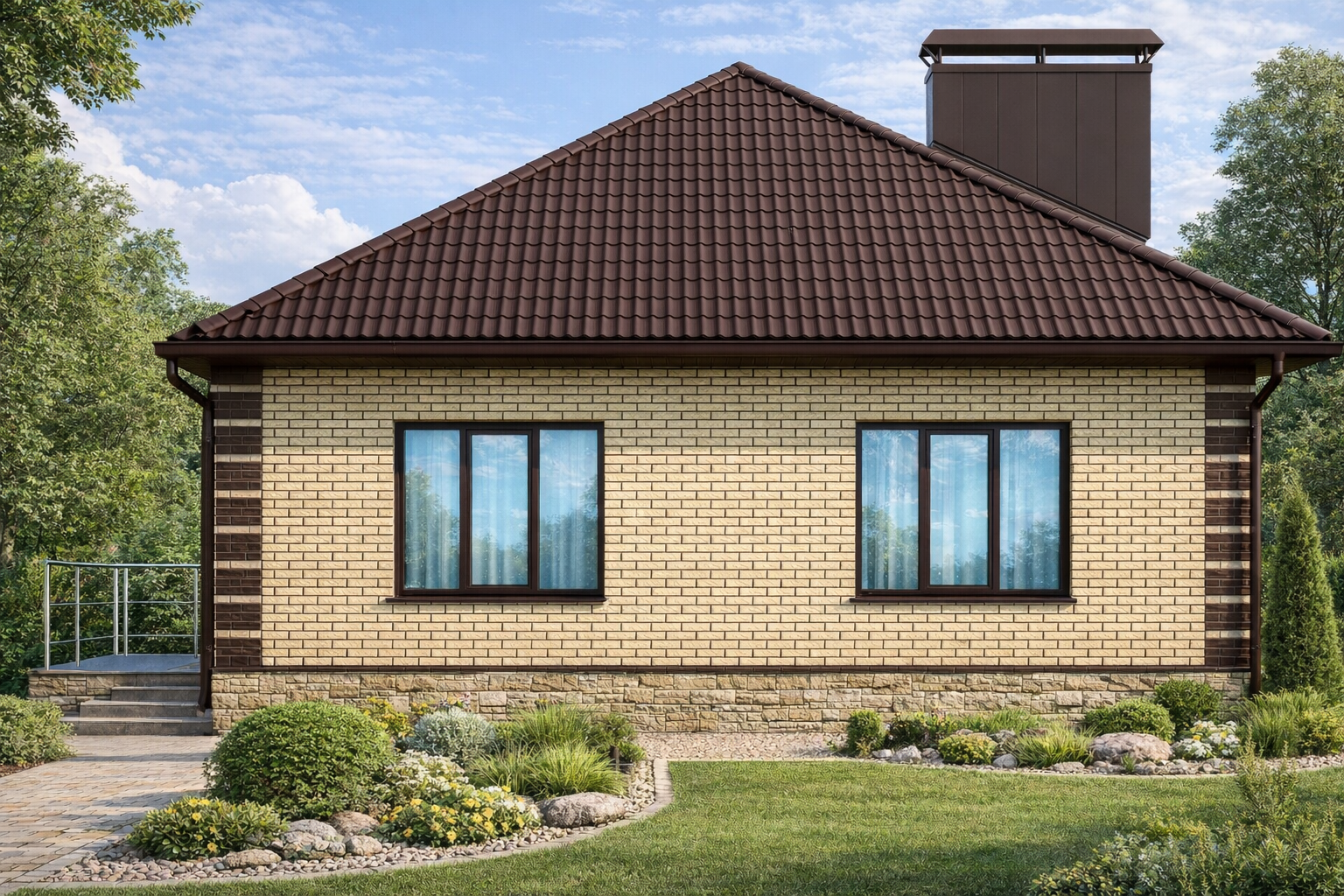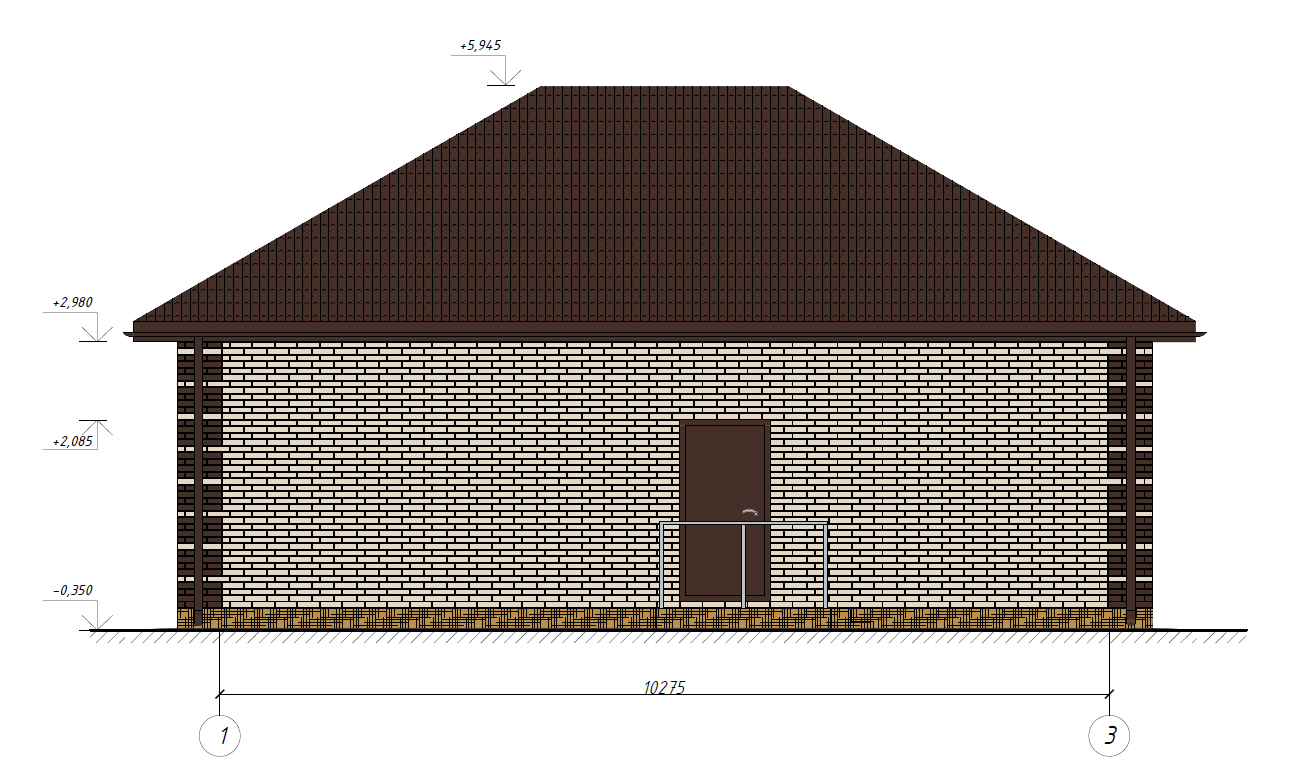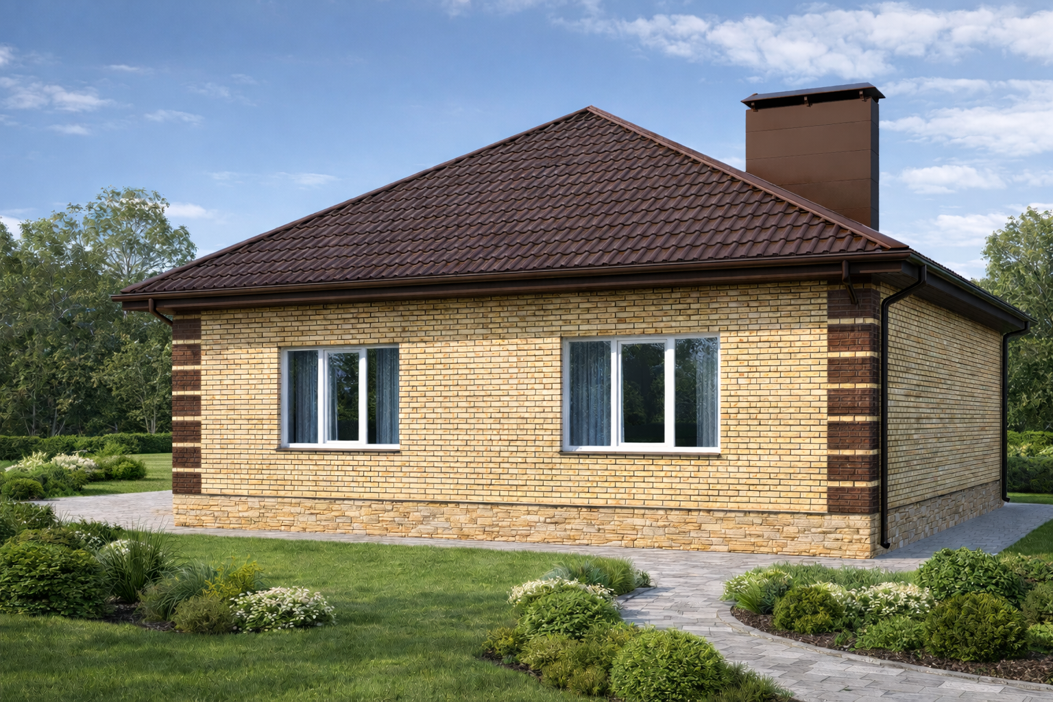 Компактный, уютный одноэтажный жилой дом площадью 75,3 кв.м, имеет габаритные размеры 11,3х8,4м. Выполнен из пеноблока с облицовкой кирпичем. Так же возможны варианты из других материалов таких как керамический блок, керамический кирпич и т.д.